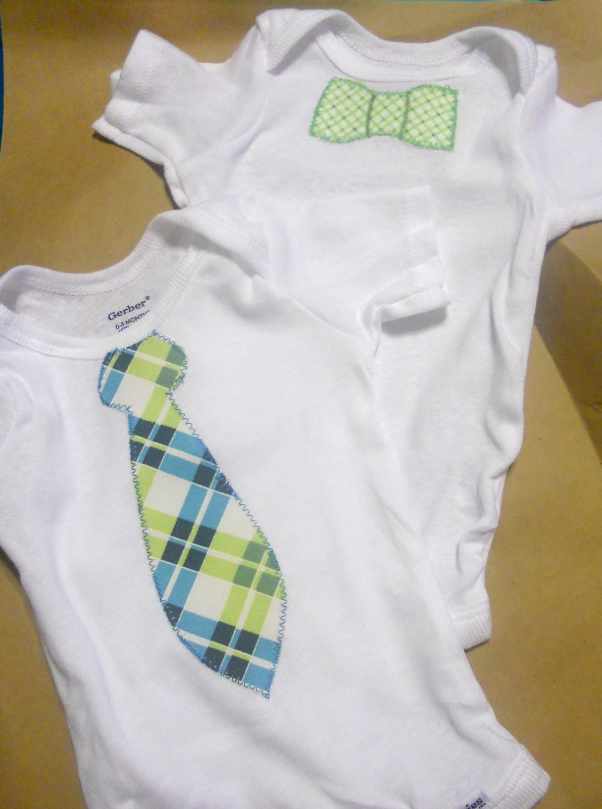 I thought the gift needed a little something else. so I snagged these white onesies that Mom had left over from another shower gift. Little girls seem to have the market on cuteness in the clothing department, but who says the little boys can't look dapper too? So I added a bow tie and a long tie to the onesies. Marc & Melissa's little guy will look super cool in these.